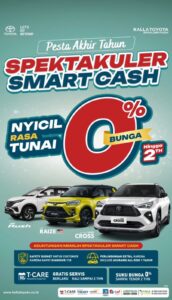 Akhir tahun menjadi momen terbaik untuk mewujudkan impian memiliki mobil baru. Toyota melalui dealer resminya menghadirkan promo istimewa bertajuk Pesta Akhir Tahun Spektakuler Smart Cash, sebuah program pembelian mobil Toyota dengan skema cicilan ringan rasa tunai dan bunga 0% hingga 2 tahun. Promo ini dirancang khusus untuk memberikan kemudahan, kenyamanan, serta keamanan finansial bagi konsumen yang ingin memiliki mobil Toyota terbaru tanpa beban bunga.